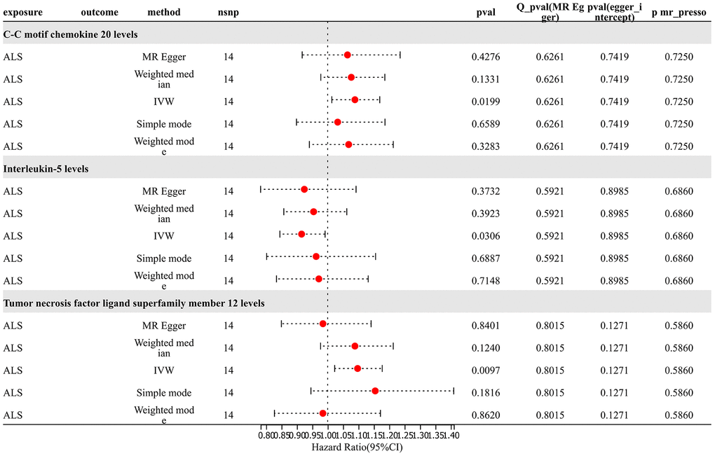 For analysis of Mendelian randomization results for ALS and 91 inflammatory proteins, SNP (P < 5×10^-8) was chosen as the threshold to extract instrumental variables for TSMR analysis. The results revealed that an increased risk of ALS was associated with elevated levels of C-C motif chemokine 20 (OR=1.088, PIVW = 0.020). The risk of ALS increased with elevated levels of Tumor Necrosis Factor Ligand Superfamily Member 12 (OR=1.097, PIVW =0.010). The analysis indicated no significant heterogeneity (Q p-value > 0.05) or horizontal pleiotropy (P Egger Intercept > 0.05) for all the results. Conversely, an increased risk of ALS was associated with decreased levels of Interleukin-5 (OR=0.915, PIVW =0.031). Sensitivity analysis through leave-one-out method demonstrated the robustness of the results (Figure 7 and Supplementary Table 9).