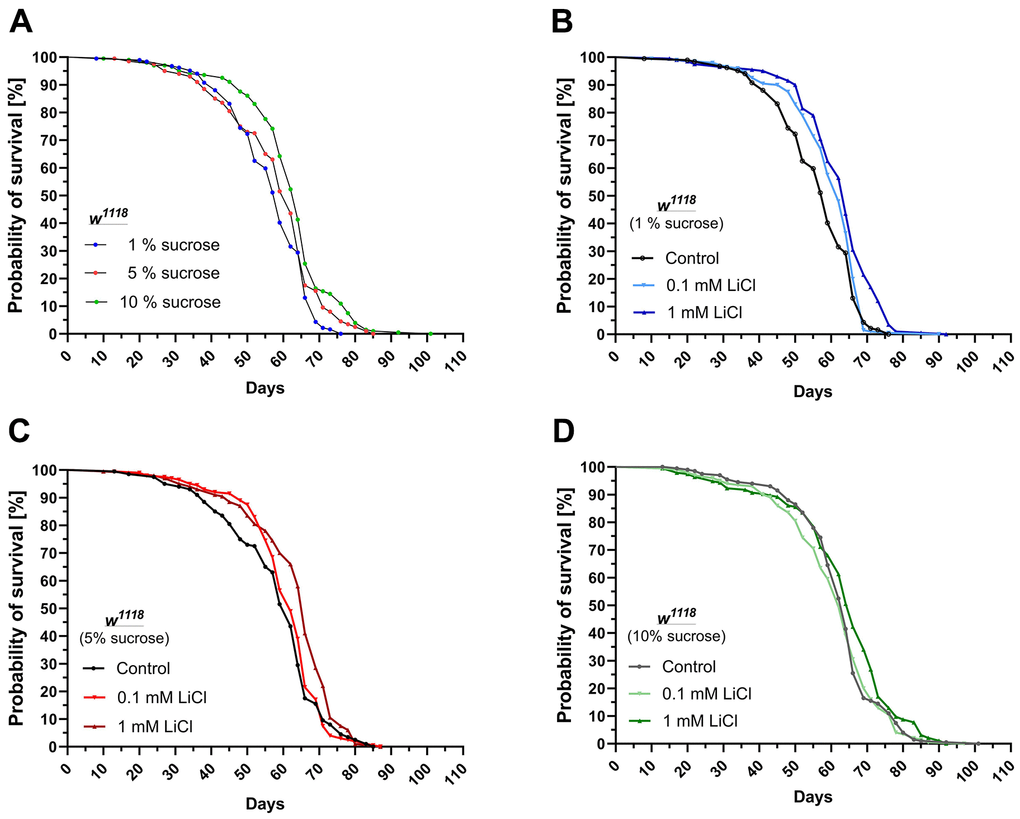 Figure 1. Lithium and dietary sucrose have a similar impact on the lifespan. Female w1118 flies were subjected to life-long interventions receiving either the 1%, 5% or 10% sucrose diet supplemented with 0, 0.1 or 1 mM LiCl. (A) Increasing the dietary sucrose content to 10% extended the lifespan of the flies. (B) Supplementing 0.1 or 1 mM LiCl to the 1% sucrose diet extended the lifespan in a similar manner. (C) Supplemented to the 5% sucrose diet, only the dose of 1 mM LiCl significantly improved survival. (D) When added to the 10% sucrose diet, the positive impact of lithium on the lifespan further declined. Survival curves were compared using the Log-Rank Mantel-Cox test (p ≤ 0.05).
