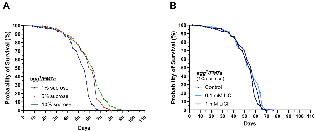 Figure 2. sgg1FM7a are less responsive to lithium but highly responsive to dietary sucrose in regards of lifespan extension. Female sgg1FM7a flies were subjected to life-long interventions receiving either the 1%, 5% or 10% experimental diet supplemented with 0, 0.1 or 1 mM LiCl. (A) Dietary sucrose promoted longevity in sgg1FM7a. (B) Supplementing 0.1 or 1 mM LiCl to the 1% sucrose diet mildly promoted survival in sgg1FM7a. Survival curves were compared using the Log-Rank Mantel-Cox test (p ≤ 0.05).