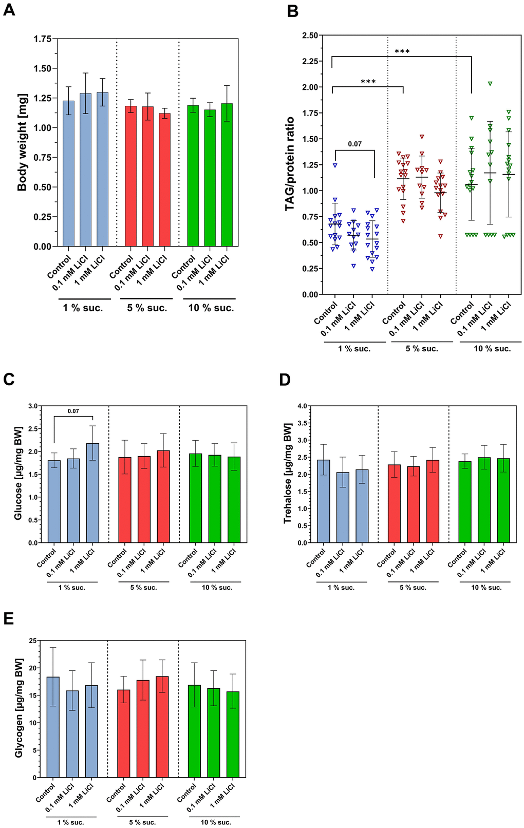 Figure 3. Lithium and dietary sucrose affect the body composition differently. Female flies were subjected to a 1%, 5% or 10% sucrose diet supplemented with 0, 0.1 or 1 mM LiCl and the body weight and body composition were examined after seven days of treatment. (A) Neither lithium, nor sucrose altered the body composition (one-way ANOVA, p ≤ 0.05). (B) Feeding 1% sucrose significantly lowered the TAG/protein ratio compared to a 5% or 10% sucrose diet (Dunnett’s T3 multiple comparisons test, ***p ≤ 0.001). (C–E) Supplementing 1 mM LiCl to the 1 % sucrose diet slightly increased whole-body glucose level in the fly (one-way ANOVA, p = 0.07). Altering the sucrose content of the diet had no impact on any of the carbohydrate levels in the fly. Bars represent means ± SD. TAG, triacylglycerides; Suc., sucrose; BW, body weight. All data are reported as mean ± SD.