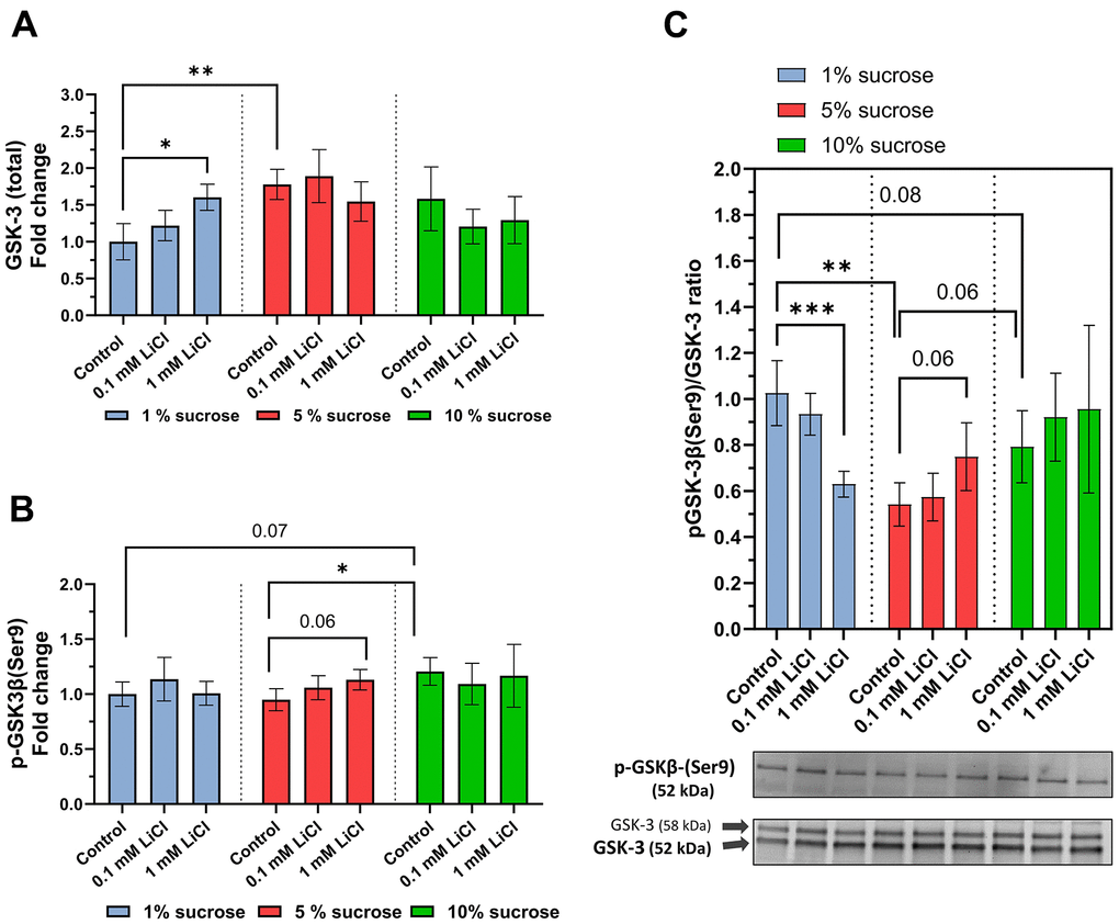Figure 4. Dietary sucrose modulates lithium’s influence on the GSK-3 phosphorylation ratio. Whole-body protein extracts of w1118 females treated with the experimental diet were obtained for Western blot analysis. (A) 1 mM LiCl supplemented to the 1% sucrose diet elevated total levels of GSK-3 (Dunn’s multiple comparisons test, *p ≤ 0.05) as did elevating the dietary sucrose content up to 5% (Dunnett’s T3 multiple comparisons test, **p ≤ 0.005). (B) Lithium supplemented to the 5% sucrose diet elevated levels of p-GSK-3 similar to the 1% sucrose diet compared to the 5% and 1% sucrose diets (Dunnett’s T3 multiple comparisons test, *p ≤ 0.05). (C) Lithium significantly lowers the pGSK-3/GSK-3 ratio when added to the 1% sucrose diet (Dunn’s multiple comparisons test, ***p ≤ 0.001). In contrast, added to the 5% sucrose diet, lithium slightly elevated the pGSK-3/GSK-3 ratio. Co-administered to 10% sucrose, lithium had no significant impact on the pGSK-3/GSK-3 ratio. In general, pGSK-3/GSK-3 ratios of flies treated with the 1% sucrose diet were significantly higher than that of those receiving the 5% and 10% sucrose diets. Two known Drosophila GSK-3 isoforms were detected at 52 kDa (G, major isoform) and 58 kDa (SGG39). Overall, feeding the non-supplemented 5% sucrose diet generated the lowest levels of pGSK-3/GSK-3 ratio (Tukey’s multiple comparisons test, **p ≤ 0.005). All data are reported as mean ± SD.