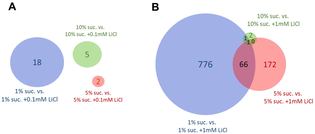 Venn diagrams were used to evaluate the impact that changing the dietary sucrose content has on gene expression in response to 0.1 mM or 1 mM LiCl. Figure 5A reveals no overlaps of genes differentially expressed by 0.1 mM LiCl added to either the 1%, 5% or 10% sucrose diet. In general, the impact of this lower lithium dose on the gene expression level was very small. A rather small number of 18 genes responsive to the addition of 0.1 mM LiCl to the 1% sucrose diet was obtained. In Figure 5B, only a single gene, lithium-inducible factor (list) [38], was found to be significantly regulated by 1 mM LiCl added to all three sugar diets.