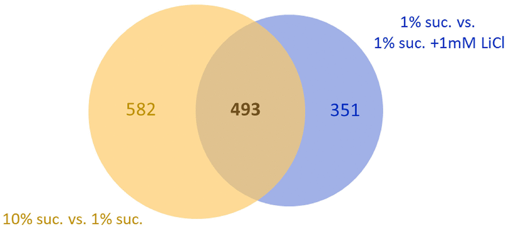 Figure 6. Supplementing 1 mM LiCl to the 1% sucrose diet mimics half of the transcriptional response to 10% dietary sucrose. The Venn diagram shows overlaps of two comparisons: 1. the genes whose transcript levels were altered by increasing the sugar concentration from 1% to 10% (yellow circle, total: 1075) and 2. genes whose transcript levels were altered by supplementation of 1 mM LiCl to the 1% sucrose diet (blue circle, total: 844). Both comparisons share an overlap of 493 co-regulated genes differentially expressed in female flies in response to both, sucrose or lithium (FDR p-value ≤ 0.05). Suc., sucrose.