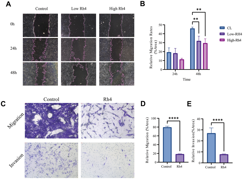 Figure 3. Impact of ginsenoside Rh4 on MG63/DXR cell migration and invasion. (A) Wound healing assay outcomes for MG63/DXR cells at 0-, 24-, and 48-hours post-treatment with control, low (20 μM), and high (40 μM) concentrations of Ginsenoside Rh4, depicting migration inhibition. (B) Quantitative analysis of the wound healing assay from panel A, indicating Ginsenoside Rh4’s effectiveness in reducing MG63/DXR cell migration. (C) Results from Transwell assays measuring MG63/DXR cell migration and invasion post-treatment with control and 40 μM ginsenoside Rh4 at 48h, revealing reduced migratory and invasive behaviors. (D) Quantitative assessment of migration from panel C, highlighting the inhibitory effect of ginsenoside Rh4 on cell migration. (E) Quantitative assessment of invasion from panel C, demonstrating ginsenoside Rh4’s ability to diminish cell invasion.