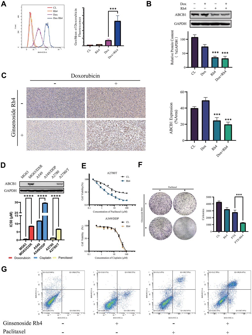 Figure 5. Molecular mechanisms underlying the reversal of drug resistance in MG63/DXR by ginsenoside Rh4. (A) An intracellular accumulation of doxorubicin in MG63/DXR cells was measured by flow cytometry, with autofluorescence intensity in the B610-ECD-A channel. The x-axis represents the fluorescence intensity, while the y-axis denotes cell count. The further right the peak of fluorescence intensity for each group, the greater the intracellular retention of doxorubicin in that group. The accompanying bar graph uses the GeoMean of fluorescence intensity to represent the amount of doxorubicin uptake for each group. (B) The expression levels of ABCB1 protein analyzed through Western blotting, employing GAPDH as an internal control. A bar graph illustrates the relative protein expression levels among the study groups. (C) Immunohistochemistry (IHC) employed to assess ABCB1 expression in vivo, with accompanying bar graphs depicting protein expression levels within each experimental group. (D) Comparative ABCB1 expression in drug-resistant versus sensitive cell lines analyzed by Western blot, including a bar graph detailing IC50 values for various cell lines and drugs, elucidating the role of ABCB1 in drug resistance. (E) Dose-response curves highlighting the sensitivities of A2780T cells to paclitaxel and A549/DDP cells to cisplatin, with and without Rh4 treatment, detailing shifts in IC50 values that signify modulation of drug sensitivity by Rh4. (F) Colony formation assays in A2780T cells exploring the synergistic effects of paclitaxel (2 μM) and Rh4 (40 μM) on cell proliferation and survival. (G) Apoptosis in A2780T cells treated with and without ginsenoside Rh4 (40 μM) and paclitaxel (2 μM) for 24 hours was analyzed using flow cytometry with Annexin V-FITC/PI staining to distinguish apoptotic cells from viable cells, highlighting the pro-apoptotic effect of Rh4 in the context of chemotherapy. In the flow cytometry plots, the y-axis represents PI staining fluorescence intensity, and the x-axis represents Annexin V-FITC fluorescence intensity. Each plot is divided into four quadrants: LL (low signal on both axes), LR (high signal on the x-axis and low on the y-axis), UL (low signal on the x-axis and high on the y-axis), and UR (high signal on both axes). These quadrants correspond to different cell states: LL for viable cells, LR for early apoptotic cells, UL for necrotic cells, and UR for late apoptotic cells. The results show a significant increase in the proportion of late apoptotic cells in the Rh4 and paclitaxel co-treatment group.