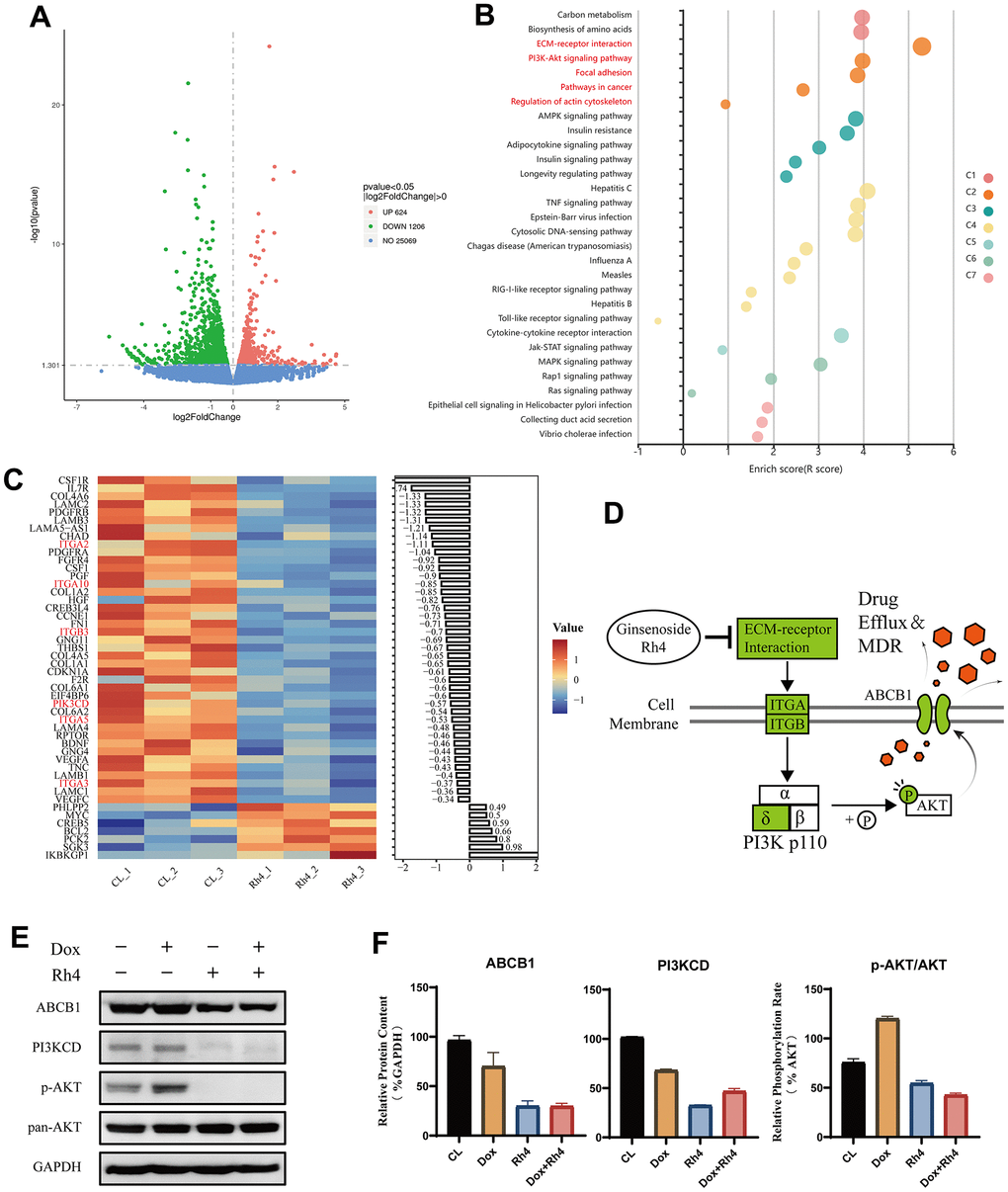 Figure 6. Differential gene expression and pathway analysis influenced by ginsenoside Rh4. (A) Volcano plot visualization of differentially expressed genes (DEGs) between the control (CL) and Rh4-treated groups, highlighting significant gene expression changes. (B) Enrichment results of KEGG pathways for DEGs between CL and Rh4 groups, depicted in various colors to represent different clusters as identified by the KOBAS-i model. (C) Heatmap representation of the regulation of PI3K/AKT pathway-related genes among DEGs between CL and Rh4 groups, illustrating the detailed gene expression modulation within this pathway. (D) Schematic representation of Ginsenoside Rh4’s modulation of ABCB1 expression via the PI3K/AKT pathway, where green denotes suppression of related gene expression. (E) Western blot analysis of ABCB1 and PI3K/AKT pathway-related protein levels, using GAPDH as an internal control. A bar graph shows the relative protein expression levels across the study groups, indicating the impact of Rh4 on these key regulatory proteins.