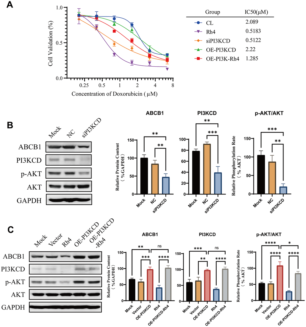 Figure 7. Rescue experiment validation of ginsenoside Rh4 reversing drug resistance via the PI3K/AKT axis. (A) Drug sensitivity curves for MG63/DXR cells to doxorubicin, illustrating the effects of PI3KCD inhibition or overexpression on drug inhibition efficiency. (B) Western blot analysis of ABCB1 and PI3K/AKT pathway-related protein levels upon PI3KCD inhibition, employing GAPDH as an internal standard to ensure consistent quantification across samples. (C) Western blot analysis detailing the levels of ABCB1 and PI3K/AKT pathway-related proteins following PI3KCD overexpression, with GAPDH used as a baseline for normalization.