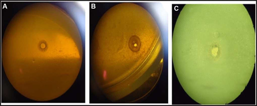 Figure 1. A lytic effect of vesicles: reference strains of S. aureus on B. subtilis (A); isolates of S. aureus on B. subtilis (B); reference strains of B. subtilis on reference strains of S. aureus (C).