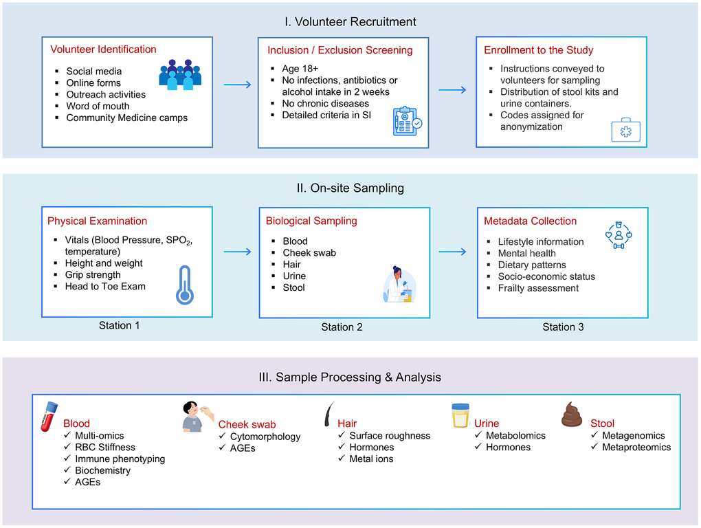 Figure 2. BHARAT study workflow for recruitment, sampling, and analysis. Schematic overview of the three-stage study pipeline comprising (I) volunteer recruitment and screening, (II) on-site clinical examination, biospecimen collection, and metadata acquisition, and (III) sample processing and multi-modal analysis. Blood, cheek swab, hair, urine, and stool samples are subjected to complementary molecular, cellular, biochemical, and omics-based assays to enable integrated phenotyping of biological aging across cohorts.