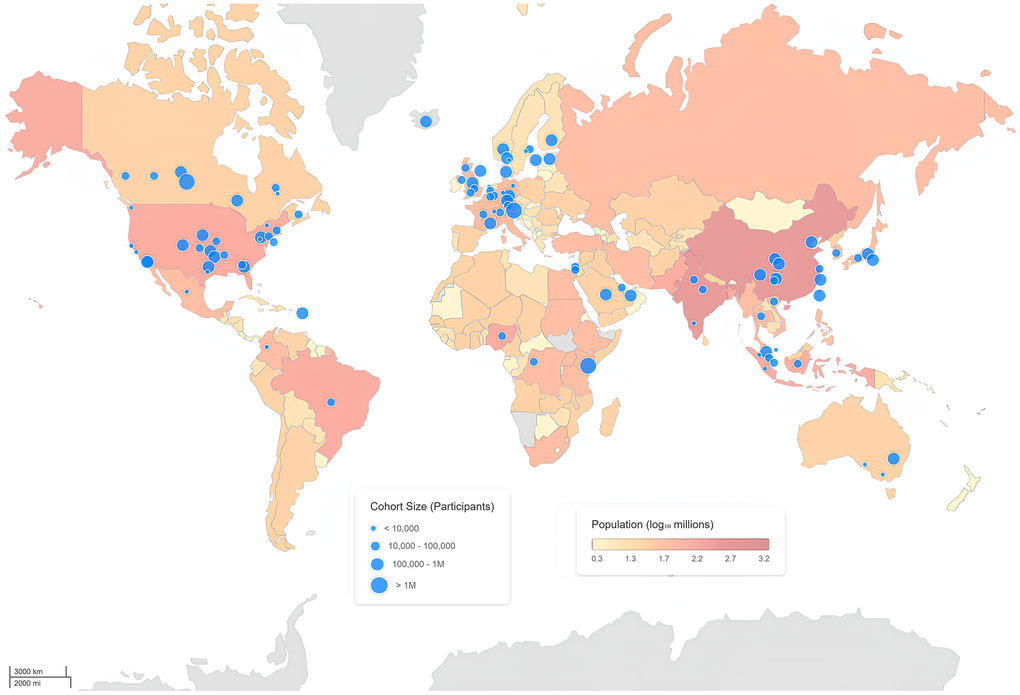 Figure 3. Global distribution of multi-omics cohorts studying healthy populations. World map depicting the geographic distribution of multi-omics studies conducted in healthy volunteers. Blue circles indicate the location of individual cohorts, with circle size proportional to cohort size (number of participants). Country-level population size (log scale, millions) is overlaid as a choropleth to provide demographic context. The map highlights the global concentration and regional disparities of existing multi-omics cohorts generating at least one omics dataset from biological samples (See Supplementary Information for details of datasets and analysis).