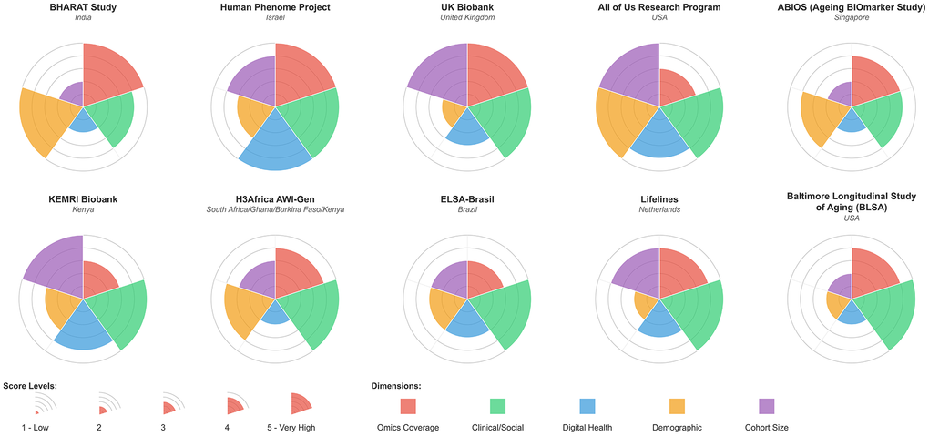 Figure 4. Radar plots of representative worldwide multi-omics cohorts scored on 5 different criteria: Omics coverage, clinical/social metadata collection, use of digital health tools, demographic coverage, and cohort size. Each category is scored on a scale of 1-5. The in-depth criteria and justification for scoring are given in Supplementary Information.