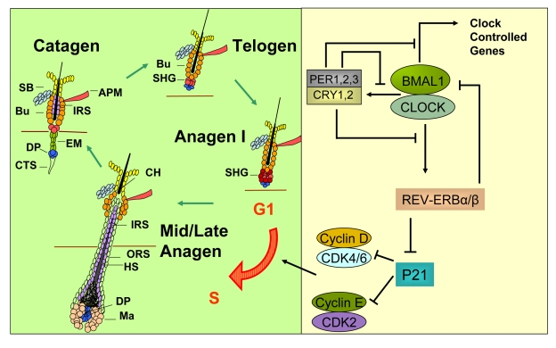 Figure 2.A model for how circadian clock genes participate in regulation of the synchronized hair growth cycle through regulation of cell cycle progression in the secondary hair germ.The hair growth cycle (left panel) is a