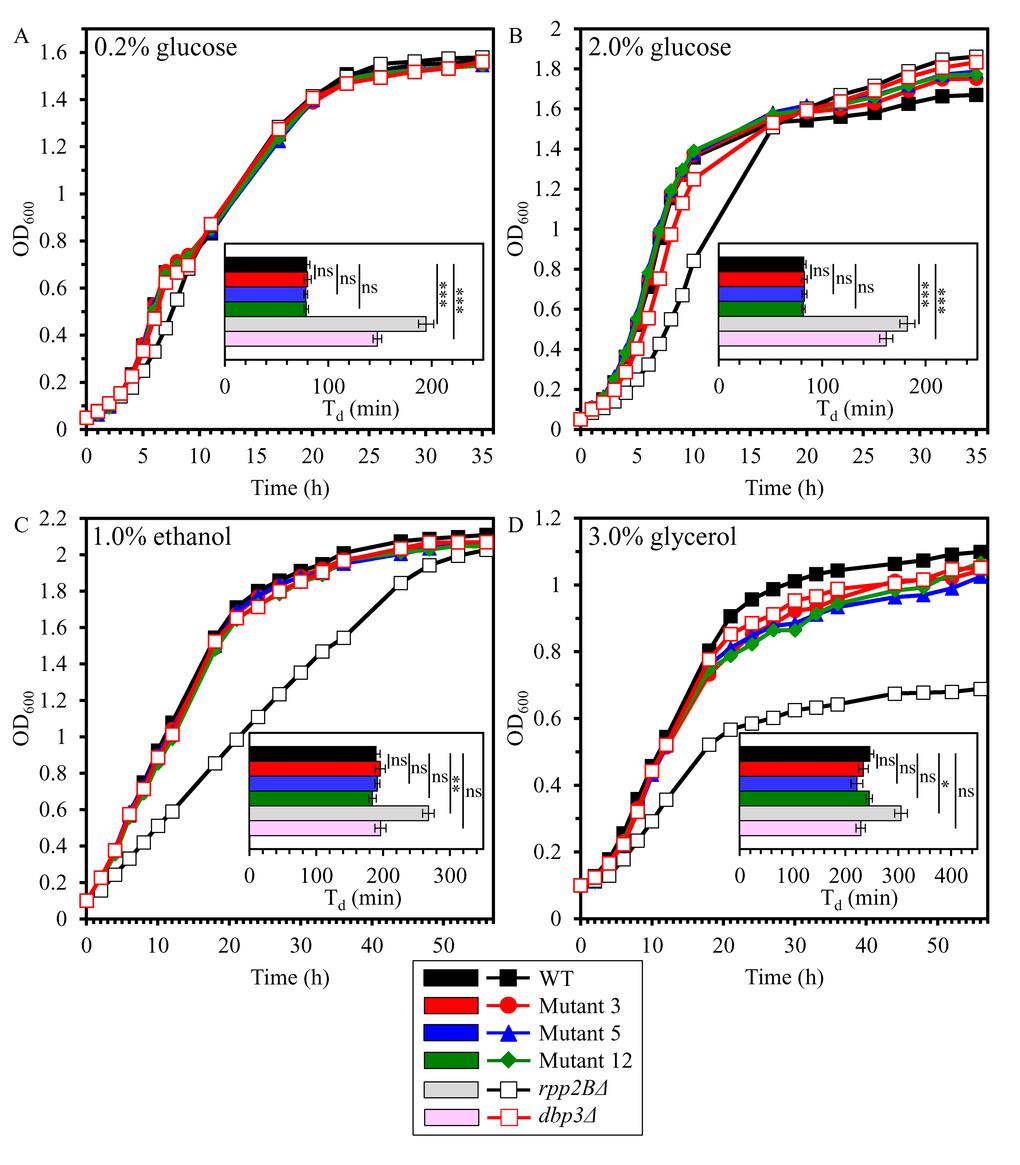 Figure 1.The long-lived mutant strains 3, 5 and 12 do not differ from the parental WT strain in the exponential growth rates and post-exponential growth efficacies in medium initially containing fermentable or non-fermentable carbon source. The parental haploid WT strain BY4742, long-lived mutant strains 3, 5 and 12 (each in the BY4742 genetic background), and the single-gene-deletion mutant strains rpp2BΔ and dbp3Δ (each in the BY4742 genetic background) were cultured in YP medium initially containing 0.2% glucose (A), 2.0% glucose (B), 1.0% ethanol (C) or 3.0% glycerol (D). The OD600 of cell cultures recovered at different time points was measured. Growth curves are shown; data for growth curves are presented as means (n = 3). For each strain, a doubling time (min) was calculated as Td = (t2 – t1) × log 2/log (OD2/OD1), where: t2 = a given time point; t1 = an earlier time point; OD2 = OD600 at a given time point; OD1 = OD600 at an earlier time point. Data for the values of Td are presented as means ± SEM (n = 3; ns, not significant; *p < 0.05; **p < 0.01; ***p < 0.001).