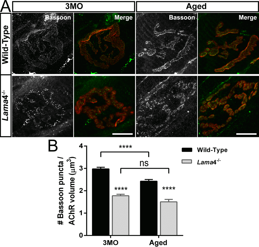 Figure 2.Decreased density of active zone marker Bassoon at lama4-/- neuromuscular junctions during adulthood and aging. (A) Representative staining of Bassoon (grayscale in single channel and green in merged channels) with respect to postsynaptic AChR endplate (red) in diaphragm muscle. WT NMJs at both ages; 3MO and aged group presented uniformly distributed Bassoon puncta while aged-matched lama4-/- NMJs showed irregular distribution of Bassoon puncta. Scale bar = 10 µm. (B) Bassoon density measured by number of puncta over volume of postsynaptic AChR endplates. While aged WT NMJs maintained uniform pattern of Bassoon puncta, the measurement of Bassoon density clearly showed decreased density in comparison with 3MO WT. Lama4-/- NMJs on the other hand, consistently showed decreased Bassoon density from 3MO to aged group. n = 3 for each genotype per age, NMJs = 47-55 for WT, NMJs = 33-69 for lama4-/-. Statistical analysis was performed using two-way ANOVA with Tukey’s post hoc test; values are presented as mean ± SEM (**** P < 0.0001).