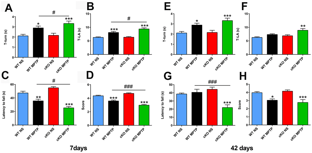Figure 1.Deletion of NRSF in the brain exacerbates motor defects induced by MPTP. (A–D) Behavioral assays at 7 days after saline or MPTP administration. (A, B) Pole test results. (A) Time to turn. (B) Total time. N = 18-21. (C, D) Wire hanging test results. (C) Latency time. (D) Score. N = 16-19. (E–H) Behavioral assays at 42 days after saline or MPTP administration. (E, F) Pole test results. (E) Time to turn. (F) Total time. N = 9-12. (G, H) Wire hanging test results. (G) Latency time. (H) Score. N = 9-11. All data are means ± SEM. Differences were analyzed by one-way ANOVA. *p < 0.05, **p < 0.01, ***p < 0.001, vs saline-treated control; #p < 0.05, ### p < 0.001, vs MPTP-treated WT mice.