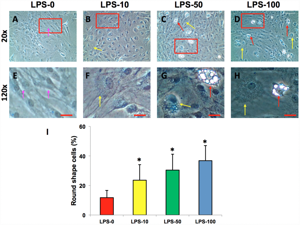 Figure 3.LPS effect on the proliferation and differentiation of rabbit AF cells cultured for 7 days. LPS not only decreased the proliferation of rabbit AF cells, but also induced significantly morphological change in rabbit AF cells during the culture (A–H). The results showed that the cell number was decreased with increasing the concentration of LPS. Many cells have changed their shape from spindle shape to round shape (yellow arrows in B–D, F–H). Some adipocyte-like cells were also found in the LPS-treated groups (red arrows in C, D, G, H). Semi-quantification indicated that the round shape cells were increased at a LPS concentration dependent manner (I). The images of E–H were the enlarged images of the box areas in the images of A–D. *p<0.05 compared to the control group. White bars = 200 μm, red bars = 50 μm.