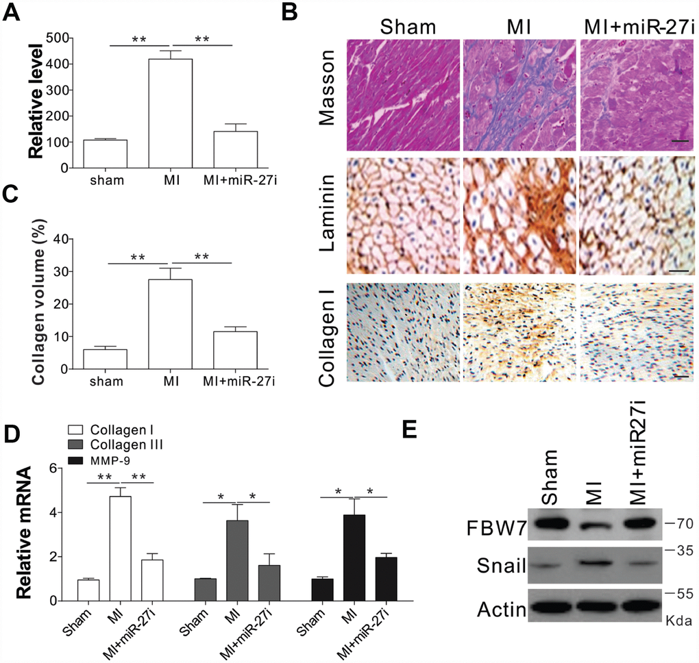 Figure 6.Antagomir-27b attenuated cardiac fibrosis in rat model of MI (A) Real-time PCR results of miR-27b levels in miR-27i or saline-treated specimens (3 weeks post-injection). (B, C) Analytical results of miR-27i-treated peri-infarct area of rat heart (3 weeks post-treatment). (B) Typical heart sections after treatments of Masson trichrome staining, laminin and collagen I immunostaining. Scale bar, 20 μm. (C) The percentage of tissue area represented the deposition of collagen I, where the automated image analyzer was used for its quantification. (D) Quantitative reverse transcription–PCR results of collagen I, collagen III, and MMP-9 mRNA levels. (E) FBW7 and Snail expression in rat heart. Data were represented as mean ± SEM (n=6). *, p<0.05; **, p<0.01.