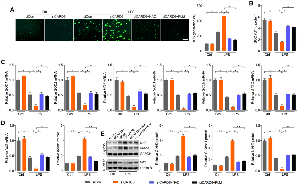 Figure 6.CARD6 knockdown-promoted oxidative stress is ROS dependent in LPS-incubated BV2 cells. (A–E) BV2 cells transfected with or without siCARD6 were pre-treated with NAC (5 mM) or PLM (10 μM) for 2 h, followed by LPS (100 ng/ml) treatment for another 24 h. Then, all cells were collected for further studies. (A) DCF-DA analysis was used for the calculation of ROS production. Scale bar: 100 μm. (B) SOD activity in cells was measured. (C) RT-qPCR analysis was used to measure the mRNA levels of SOD1, SOD2, HO1, NQO1, GCLM and GCLC in cells. (D) Nrf2 and Keap1 mRNA expression levels were determined by RT-qPCR. (E) Cytosolic Nrf2 and Keap1, and nuclear Nrf2 expression levels were assessed using western blot analysis. Data represented means ± SEM (n=6 each group). *p < 0.05 and **p < 0.01.