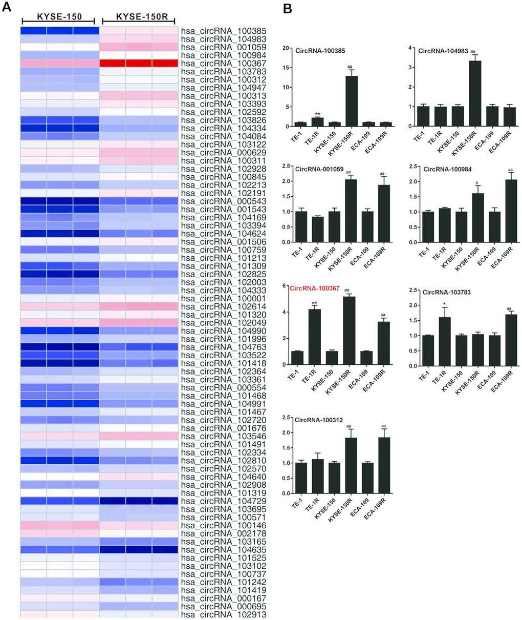 Figure 1.Expression of hsa_circRNA_100367 in human radioresistant esophageal cancer cell lines. (A) Hierarchical cluster analysis showed distinguishable circRNA expression profiles between KYSE-150 and KYSE-150R cells. (B) qRT-PCR detected circRNA_100385, circRNA_104983, circRNA_001059, circRNA_100984, circRNA_100367, circRNA_103783 and circRNA_100312 expressions in TE-1, TE-1R, KYSE-150, KYSE-150R, ECA-109, ECA-109R cells. *p<0.05, **p<0.01 vs. TE-1; #p<0.05, ##p<0.01 vs. KYSE-150; aap<0.01 vs ECA-109.