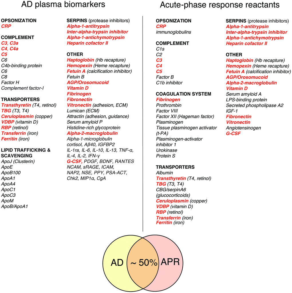 Figure 1.Comparison of AD plasma biomarkers and classical acute-phase response reactants. Shared factors are highlighted in bold red. Most AD biomarkers that are not classical acute phase response reactants represent either APR-related proteins or locally produced stress and/or signaling factors (see discussion in the text). Abbreviations: CRP (C-reactive protein); TBG (thyroxine-binding globulin); CBG (corticosteroid-binding globulin, alias transcortin, serpin A6); VDBP (vitamin D-binding protein); RBP (retinol-binding protein); AGP (alpha-1-acid glycoprotein, a.k.a. orosomucoid); IGF-1 (insulin-like growth factor 1); G-CSF (granulocyte colony-stimulating factor); Aβ40 (amyloid-beta 1-40); IGFBP2 (insulin-like growth factor-binding protein 2); IL-1ra (interleukin 1 receptor antagonist; IL-6, IL-10, IL-13, IL-4, IL-2 (interleukins 6, 10, 13, 4, and 2, correspondingly); TNF-α (tumor necrosis factor alpha); IFN-γ (interferon gamma); PDGF (platelet-derived growth factor); BDNF (brain-derived neurotrophic factor); RANTES (regulated on activation normal T cell expressed and secreted, a.k.a. CCL5, chemokine (C-C motif) ligand 5); NCAM (neural cell adhesion molecule); sRAGE (soluble receptor for advanced glycation end-products); ICAM (intercellular adhesion molecule); NAP2 (nucleosome assembly protein 2); NSE (neuron-specific enolase); PPY (pancreatic polypeptide); PSA-ACT (prostate-specific antigen-alpha-1-chymotrypsin complex); Chk2 (serine/threonine-protein kinase Chk2); MIP1α (macrophage inhibitory protein 1-alpha); CgA (chromogranin A); ApoJ (Clusterin), ApoE, ApoB100, ApoA1, ApoA4, ApoC1, ApoC3, ApoM, and ApoB (apolipoproteins J, E, B100, A1, A4, C1, C3, M, correspondingly). Compilation references: acute-phase response reactants [49, 52, 53, 57, 58]; AD plasma biomarkers [59–63].