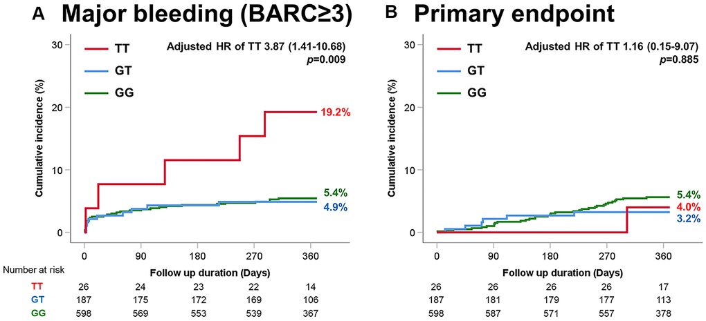 Time-to-event curves through 1-year for selected adverse events according to P2Y12 G52T variant.