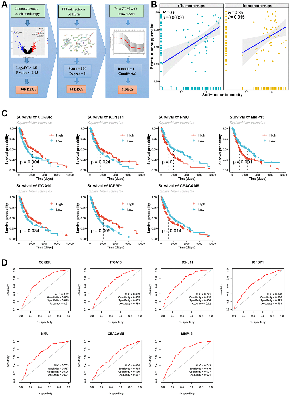 Figure 2.Flowchart of screening signature genes and its Kaplan-Meier survival curve and receiver operating characteristic curve (ROC). (A) Flowchart of screening signature genes. Including volcano plot of differentially expressed genes (DEGs), DEGs’ PPI network and Lasso-COX fitting model. (B) DEGs immune cell infiltration analysis, Pearson correlation test of Anti-tumor and Pro-tumor suppression based on immune cell type enrichment scores. (C) Log-rank test for survival curves of signature genes. (D) ROC curve, area under curve (AUC), sensitivity, specificity and accuracy values of signature genes.