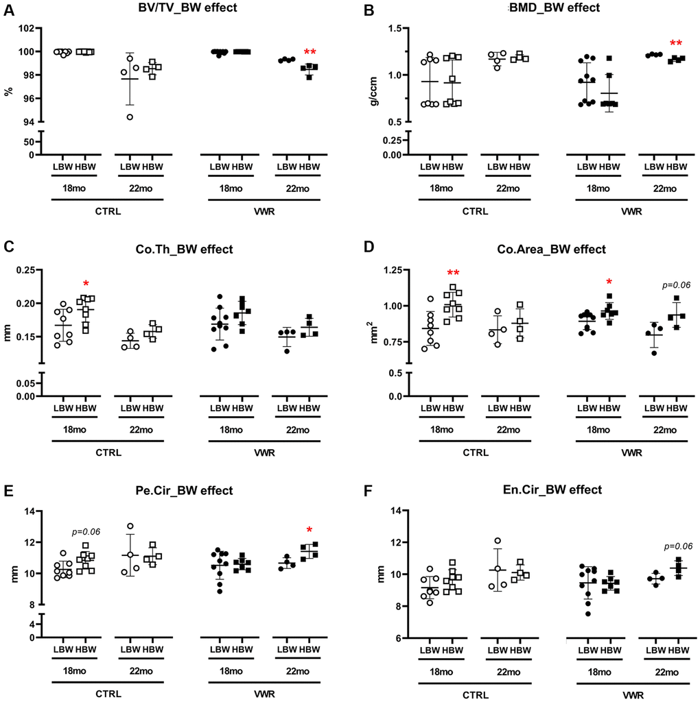 Figure 10.Body weight effects on femoral cortical parameters. The effect of body weight (BW) on femoral cortical parameters in two different age groups, 18 mo and 22 mo mice. BW effect was observed in Co.Th and Co.Area in 18 mo CTRL/HBW mice and BV/TV, BMD, Pe.Cir in 22 mo VWR/HBW mice. (A) bone volume fraction (BV/TV), (B) bone mineral density (BMD), (C) cortical thickness (Co.Th), (D) cortical area (Co.Area), (E) periosteal circumference (Pe.Cir), and (F) endosteal circumference (En.Cir), were measured by microCT. *: p < 0.05, and **: p < 0.01, HBW vs. LBW mice. Abbreviations: CTRL: control group; VWR: voluntary wheel running group; CBW: Combined groups; LBW: Low body weight group (18 mo: n = 8 CTRL, n = 10 VWR; 22 mo: n = 4 CTRL, n = 4 VWR); HBW: High body weight group (18 mo: n = 8 CTRL, n = 7 VWR; 22 mo: n = 4 CTRL, n = 4 VWR).