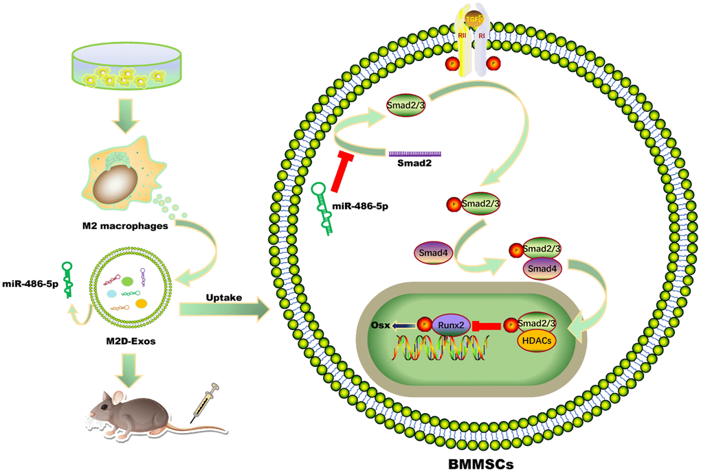 Figure 7.Schematic diagram showing the proposed mechanisms by which exosomal miR-486-5p derived from M2 macrophages regulates the osteogenic and adipogenic differentiation of BMMSCs. miR-486-5p enrichment in M2D-Exos enhances the inhibitory effect on SMAD2, resulting in downregulation of the TGF-β signalling pathway and thereby accelerating bone remodelling.
