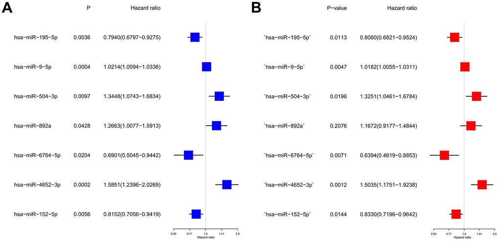 ) Univariate Cox regression analysis was used to screen seven prognosis-related miRNAs. (