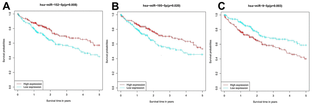 Survival analysis of the prognostic value of the miRNA candidates in HCC patients.