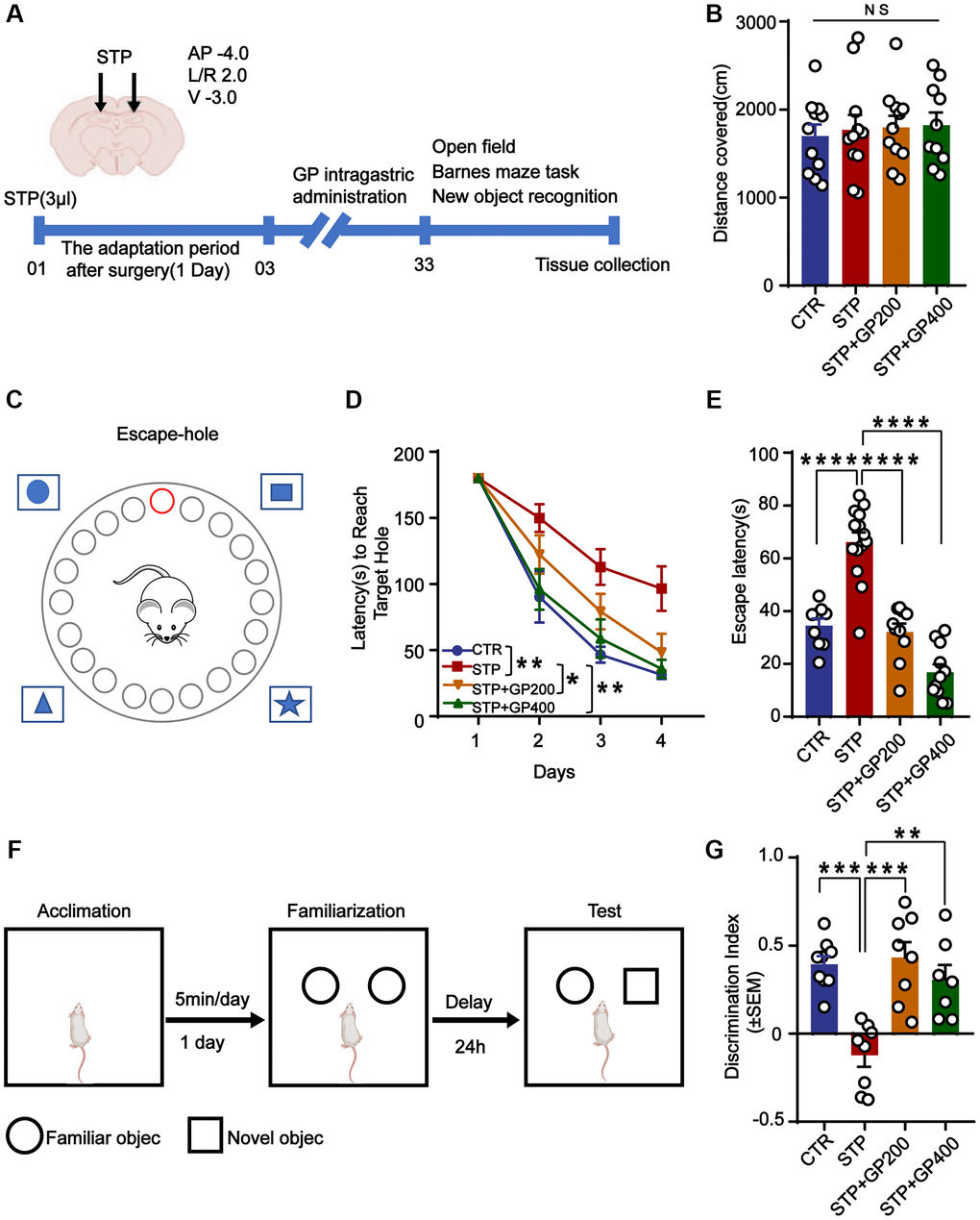 Figure 5.GP improves learning and memory impairment in STP-treated rats. (A) Study design timeline performed in the study. (B) The total distance was analyzed in the open-field test. (C–D) Escape latency in 4 days was analyzed in the Barnes maze test. (E) Escape latency on test day 5 was analyzed in the Barnes maze test. (F, G) The novel object recognition (NOR) test showed the measured recognition index of the new object within 24 hours. Data represent mean ± SEM, p-value significance is calculated from one-way ANOVA. *p < 0.05, **p < 0.01, ***P < 0.001 and ****P < 0.0001, Abbreviation: NS: no significance. n represents the number of rats in each group. For (B), Control n = 11, STP n = 11, STP+GP200 n = 11, STP+GP400 n = 10. For (D, E), Control n = 9, STP n = 14, STP+GP200 n = 10, STP+GP400 n = 11. For (B), Control n = 9, STP n = 8, STP+GP200 n = 8, STP+GP400 n = 7.