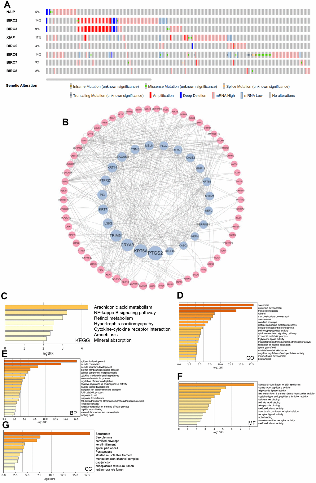 Figure 5.IAP family genetic alterations in HNSCC and pathway enrichment analysis. (A) IAP family alteration rates summarised by cBioPortal. (B) The cBioPortal database was utilised to find the 156 IAP-related co-expressed molecules that undergo the highest frequency of alteration in HNSCC. Members of the IAP family and the co-expressed genes linked with them were employed to design the PPI network. The Cytoscape database was applied in the establishment of the network. (C–G) Function enrichment analysis was performed to examine the biological roles of the IAP members and the genes they co-expressed.