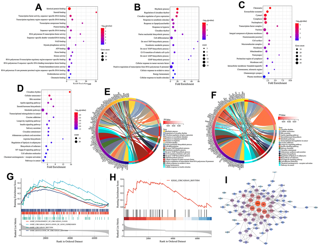 Figure 3.Functional enrichment analysis and PPI analysis. (A) Molecular function (MF) analysis (top 20 terms ranked by statistical significance). (B) Biological processes (BP) analysis (top 20 terms ranked by statistical significance). (C) Cellular component (CC) analysis (top 20 terms ranked by statistical significance). (D) KEGG pathway enrichment analysis (top 20 terms ranked by statistical significance). (E) The interaction of BPs and their associated CRGs. (F) The interaction of KEGG signaling pathways and their associated CRGs. (G) Gene set enrichment analysis (GSEA) on BPs associated with circadian rhythm. (H) Gene set enrichment analysis (GSEA) on a KEGG pathway associated with circadian rhythm. (I) The PPI network of 125 melanoma-related CRGs. Nodes are colored by degree, with redder colors indicating higher degree centrality within the network.