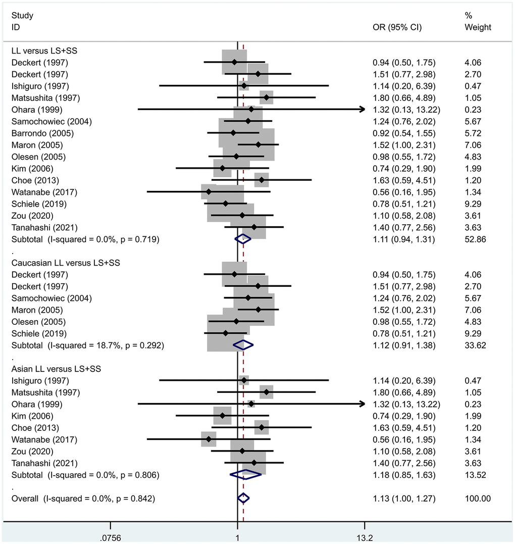 Results of the fixed-effects meta-analysis for the 5-HTTPLR genotype (LL versus LS+ SS) in PD and control groups.