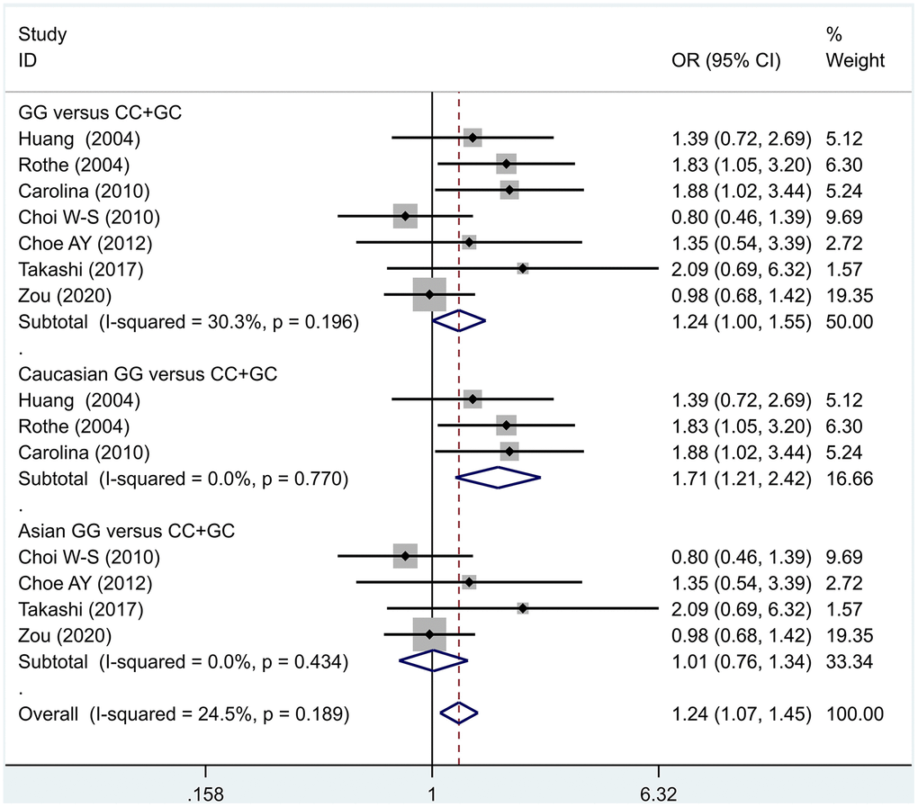 Results of the fixed-effects meta-analysis for the 5-HT1A genotype (GG versus CC +GC) in the PD and control groups.