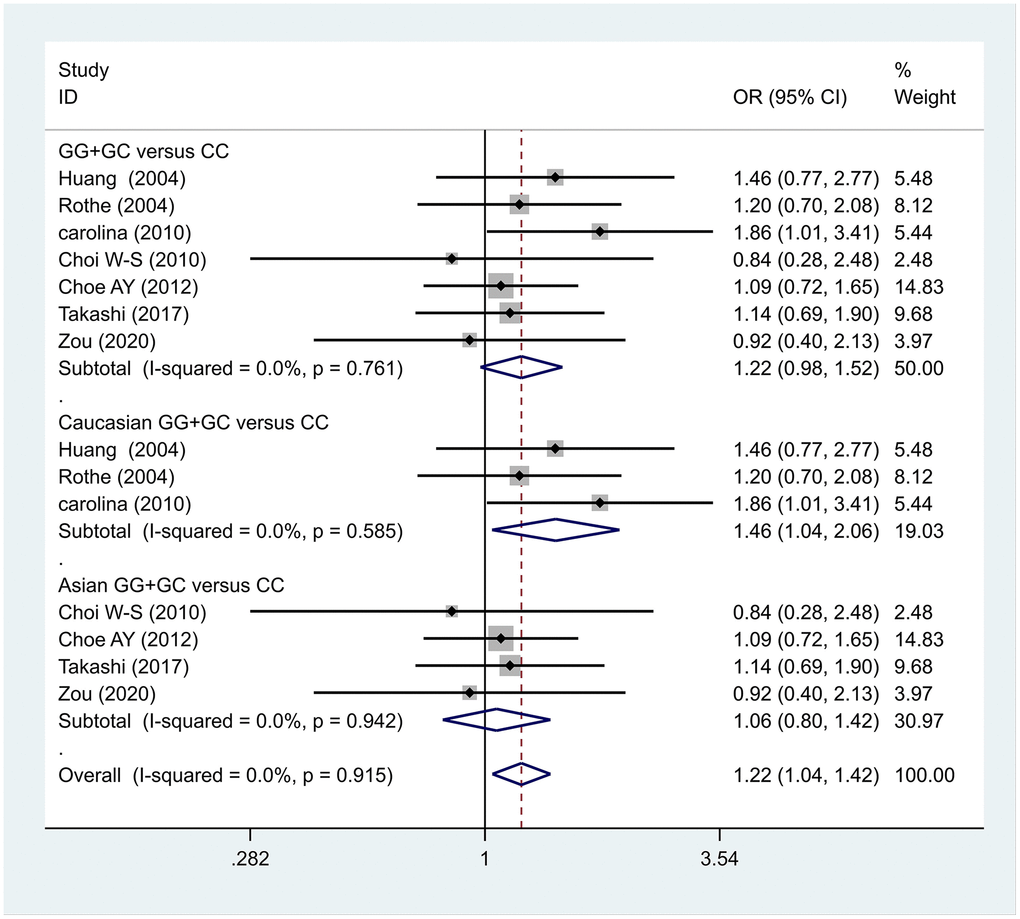 Results of the fixed-effects meta-analysis for the 5-HT1A genotype (GG+GC versus CC) in the PD and control groups.