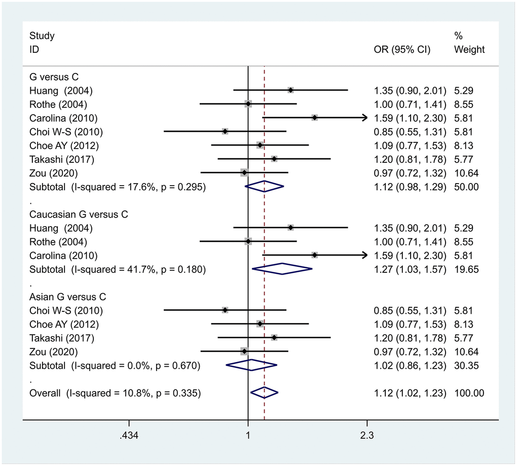 Results of the fixed-effects meta-analysis for the 5-HT1A allele (G vs. C) in the PD and control groups.