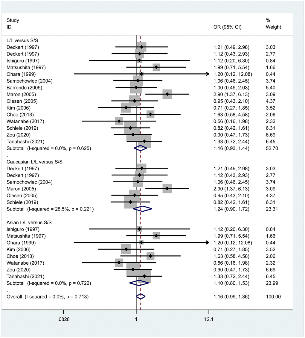 Results of the fixed-effects meta-analysis for the 5-HTTPLR genotype (L/L versus S/S) in PD and control groups.