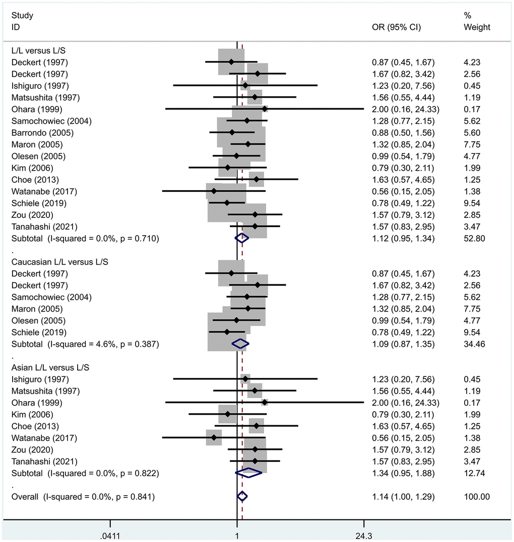 Results of the fixed-effects meta-analysis for the 5-HTTPLR genotype (L/L versus L/S) in PD and control groups.