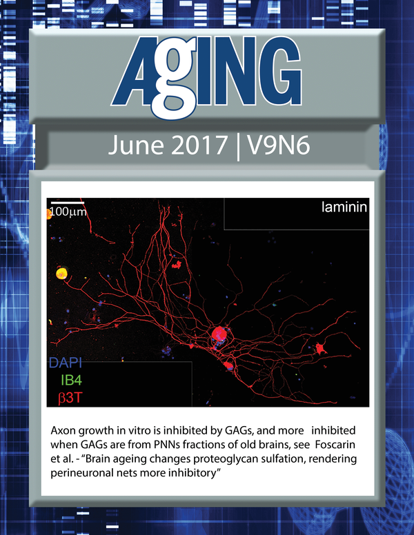 The cover for issue 6 of Aging features Figure 5C, "Axon growth in vitro is inhibited by GAGs, and more inhibited when GAGs are from PNNs fractions of old brains" from Foscarin et al.